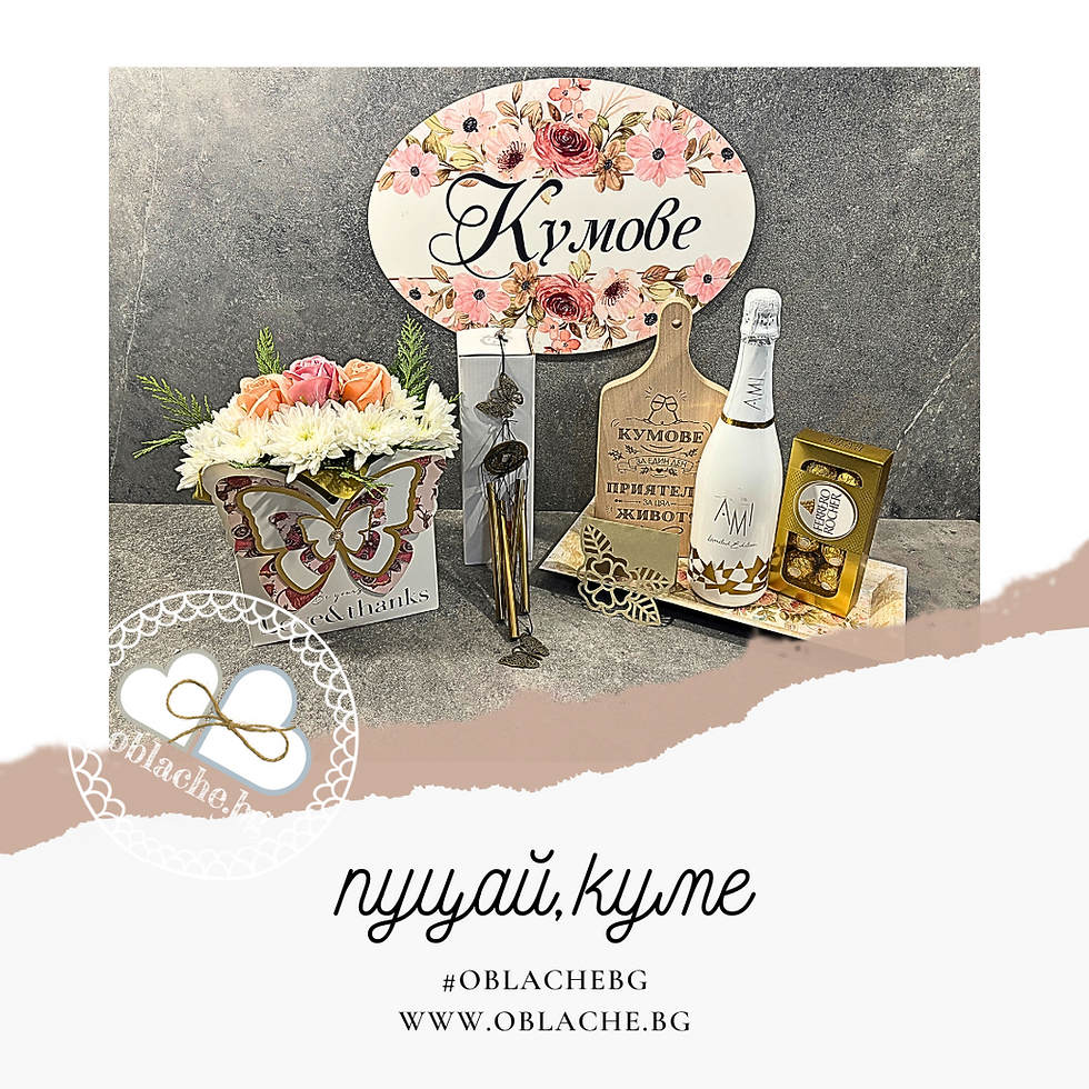 ПУЦАЙ, КУМЕ - Напитка, лакомство, 3 подаръка, контейнер, цветя и картичкач