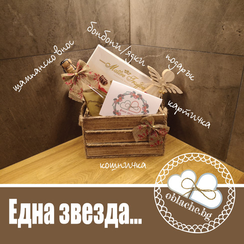 Облаче на седмицата: ЕДНА ЗВЕЗДА - Шампанско внос или алтернатива*, бонбони/ядки*,подарък* и картичка в кутия от дърво