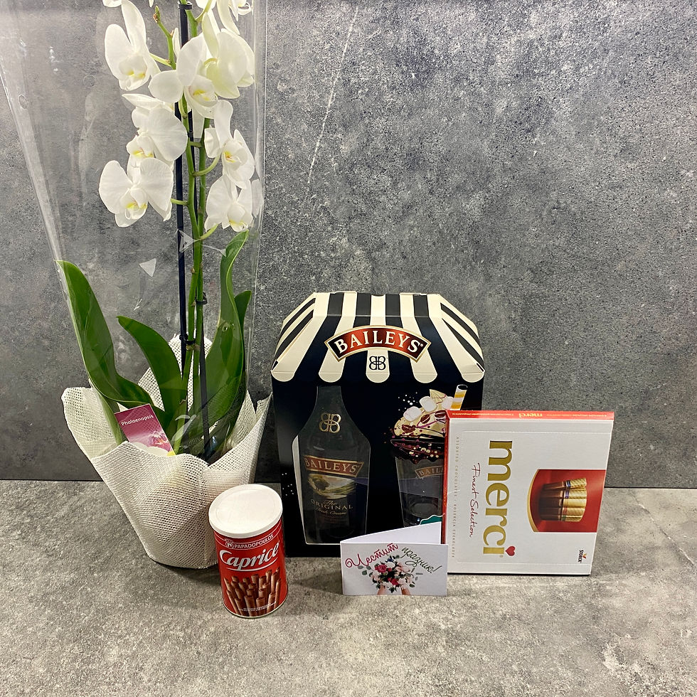 ФИНЕС - Напитка, 2 лакомства, цветя и картичка